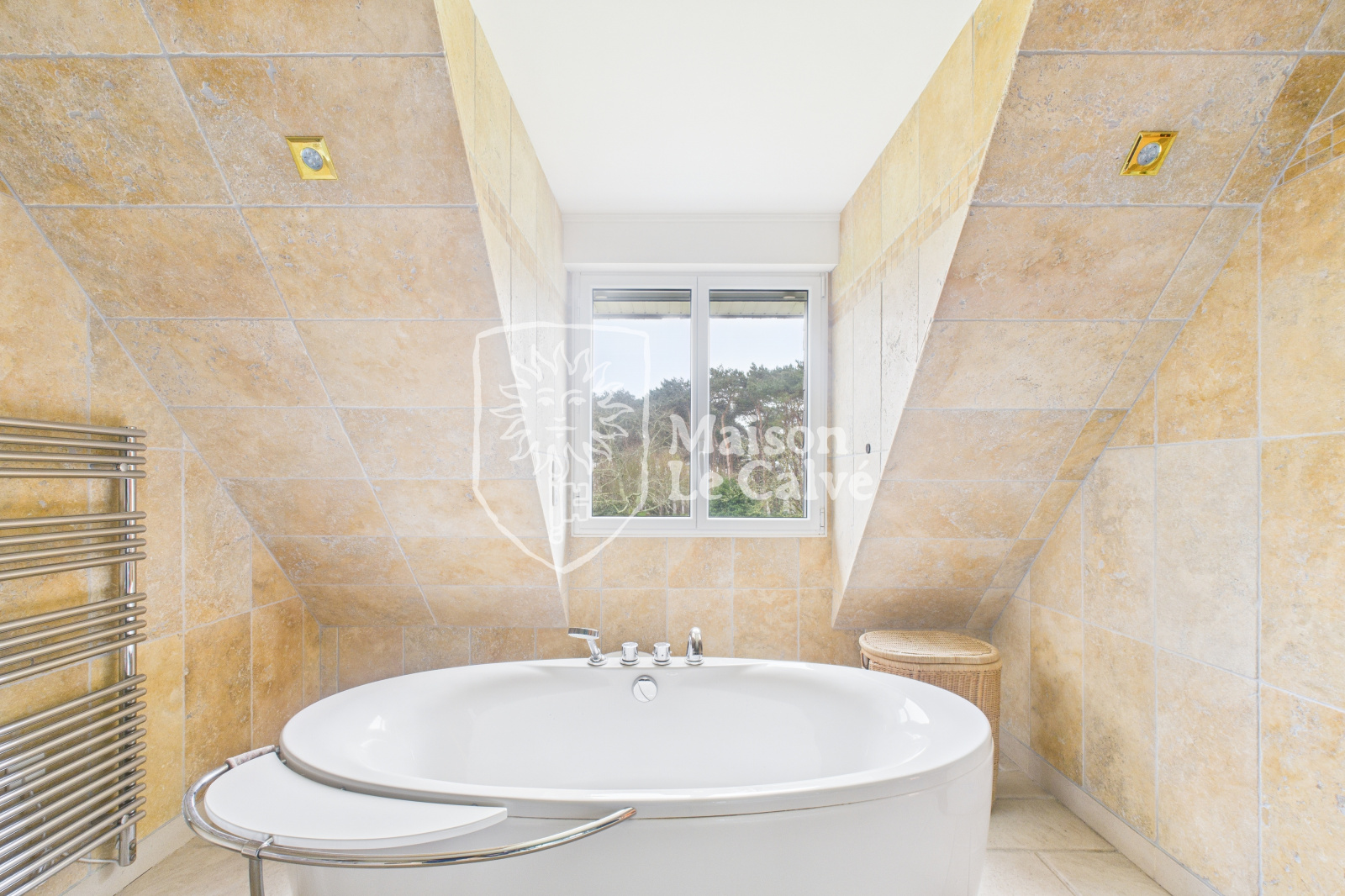 Nous tenons à souligner la qualité des matériaux engagés : menuiseries sur-mesure en chêne et divers pierres de parement dans les pièces d'eau.